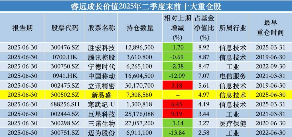 其中,翻阅过往前十大重仓股与全部持股情况来看,睿远成长价值混合在2025年上半年首次买入新易盛,该股于二季度期间首进前十大重仓股,持仓数量为730.86万股。