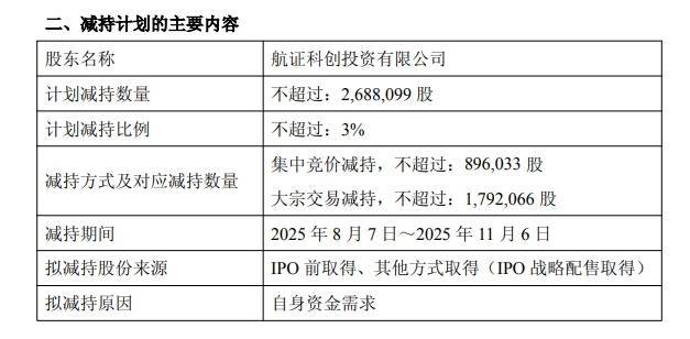 7月17日,超卓航科(688237)公告称,股东航证科创投资有限公司因其自身资金需求,计划于本减持计划公告披露之日起15个交易日后的3个月内,拟通过集中竞价方式减持所持有的公司股份不超过896,033股,减持比例拟不超过公司总股本的1%;拟通过大宗交易方式减持所持有的公司股份不超过1,792,066股配资炒股免费开户,减持比例拟不超过公司总股本的2%。